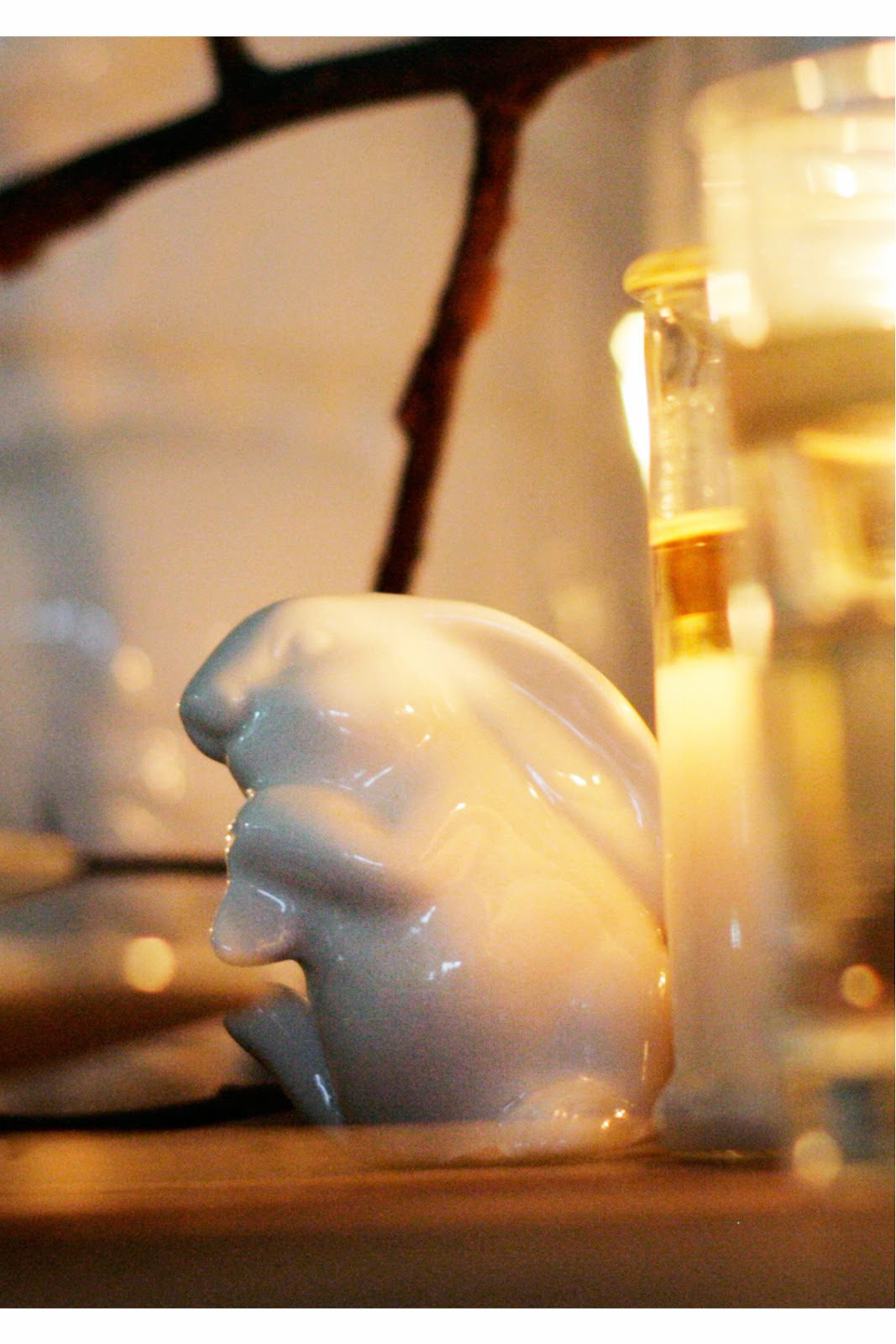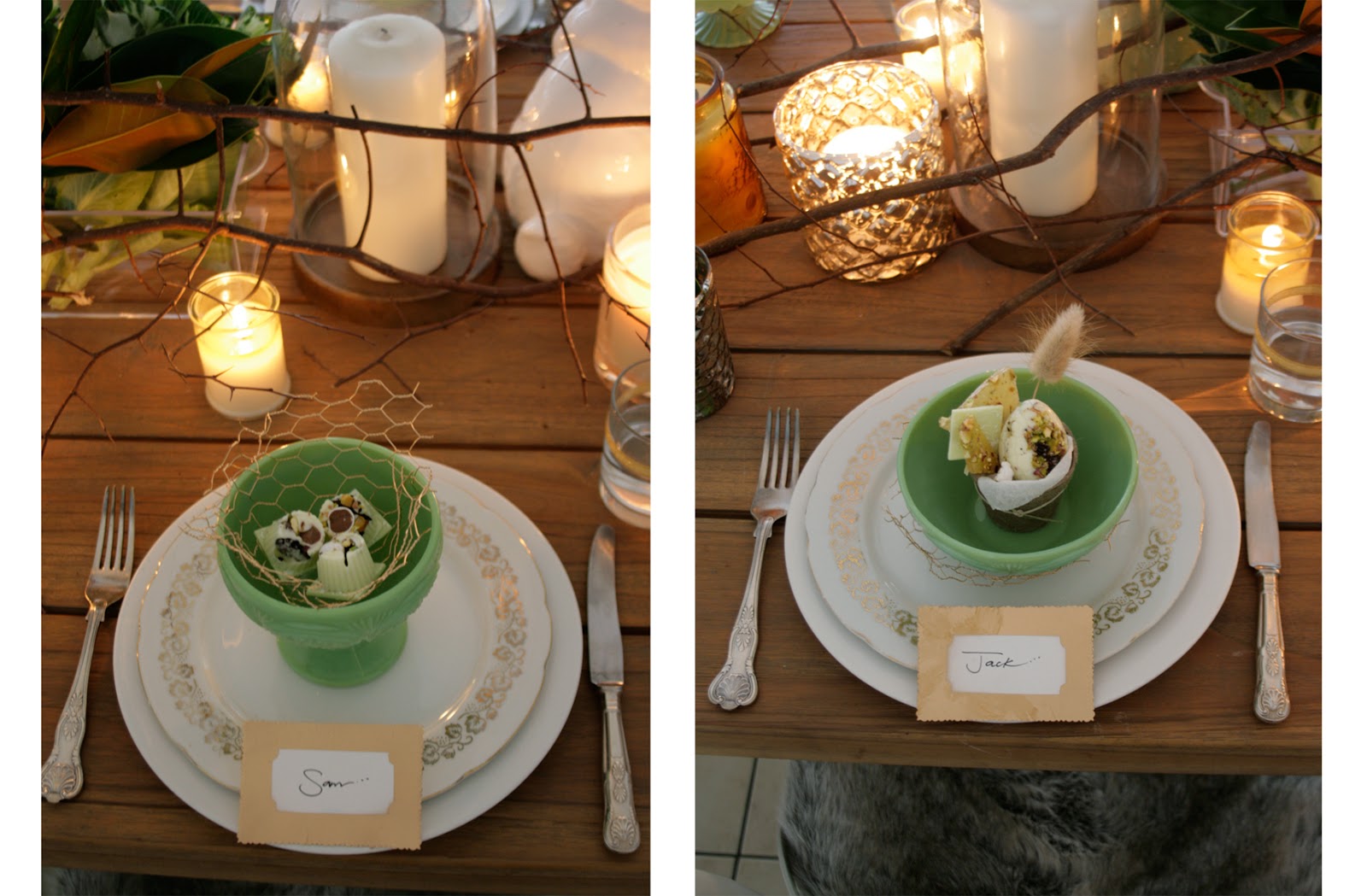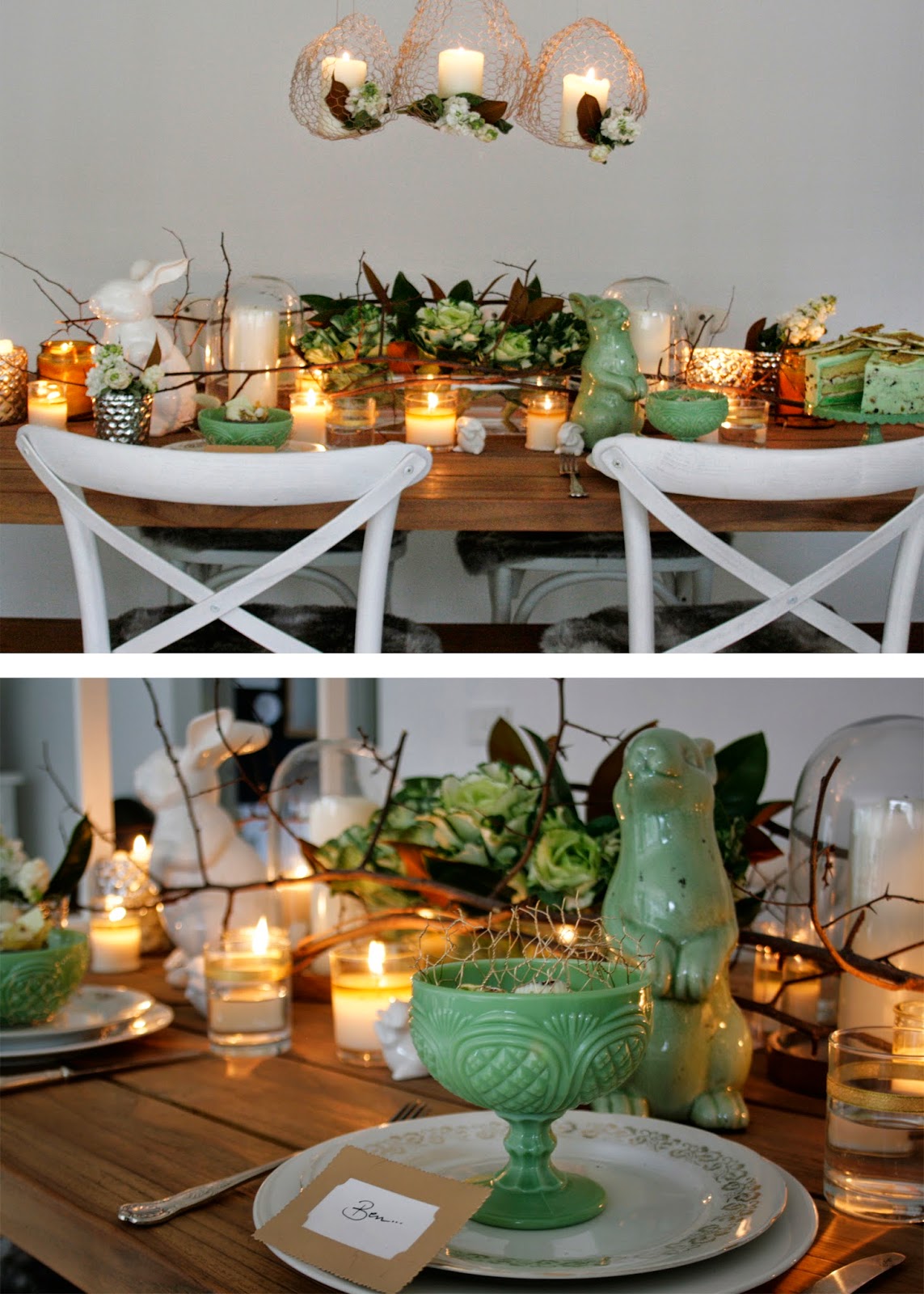 Even though the concept and styling was executed by me, it would not be this great without some of the gorgeous products from Bed Bath n' Table (ceramic bunnies, green bowls and compotes, green cake stand, wooden candle domes, silver votives and amber candles)
