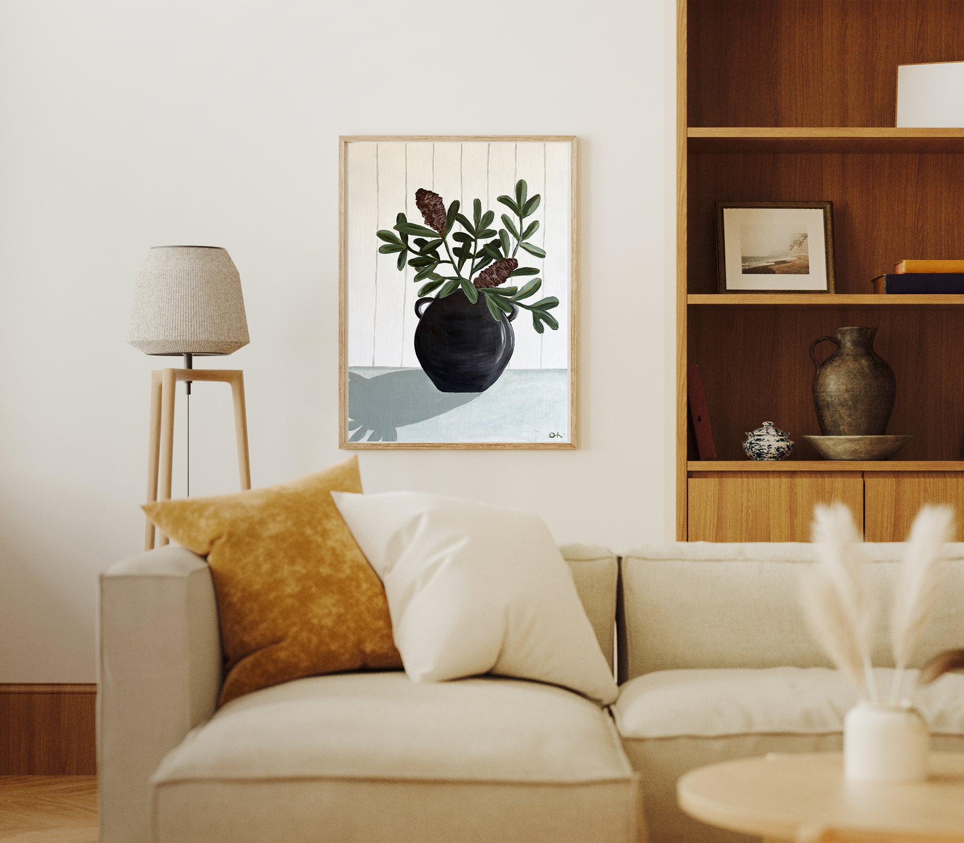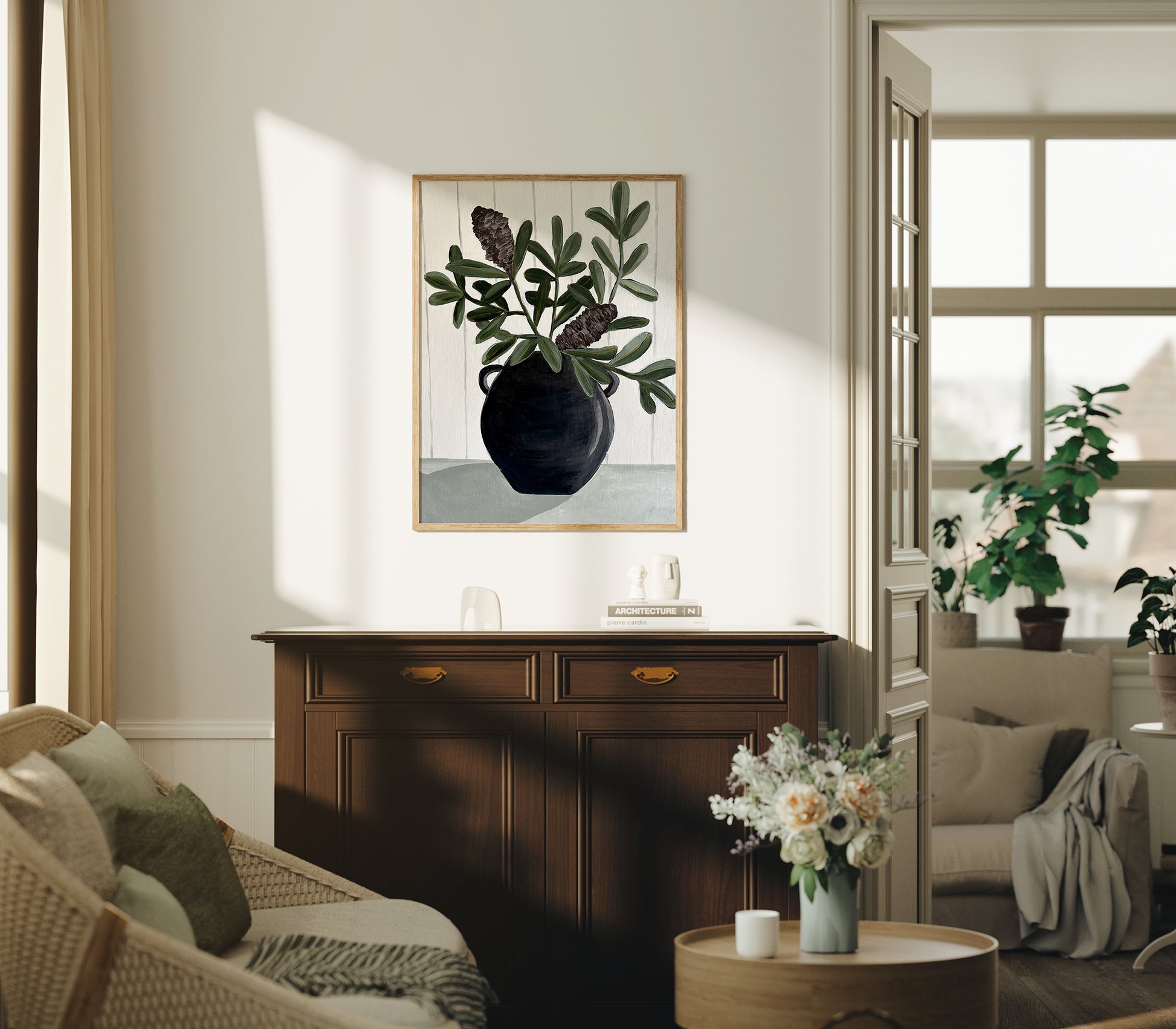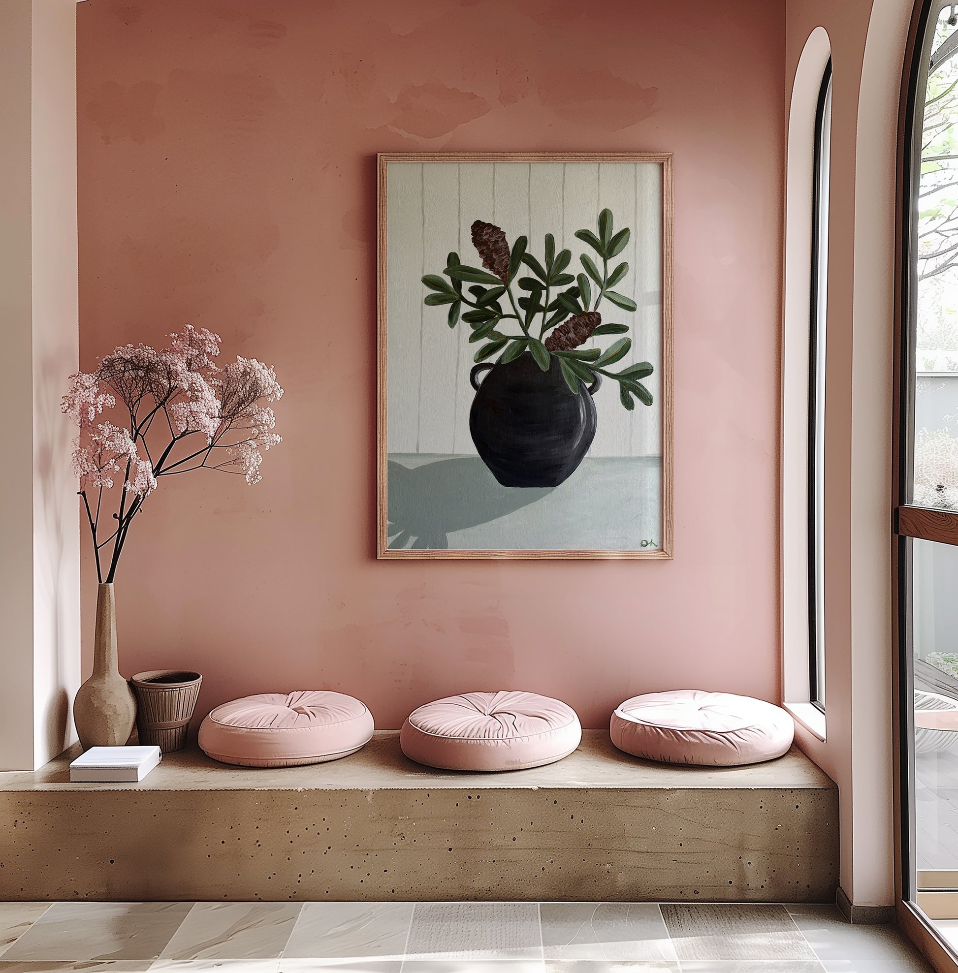 With a love for Australian flora, in particular banksias, his acrylic painting captures the timeless beauty of an old-style black rustic vase, adorned with banksia branches in soft sage green. The delicate leaves add texture and contrast against a creamy backdrop, complemented by the subtle detail of wall panels. Framed for a refined finish, this piece evokes a sense of rustic charm and quiet sophistication.