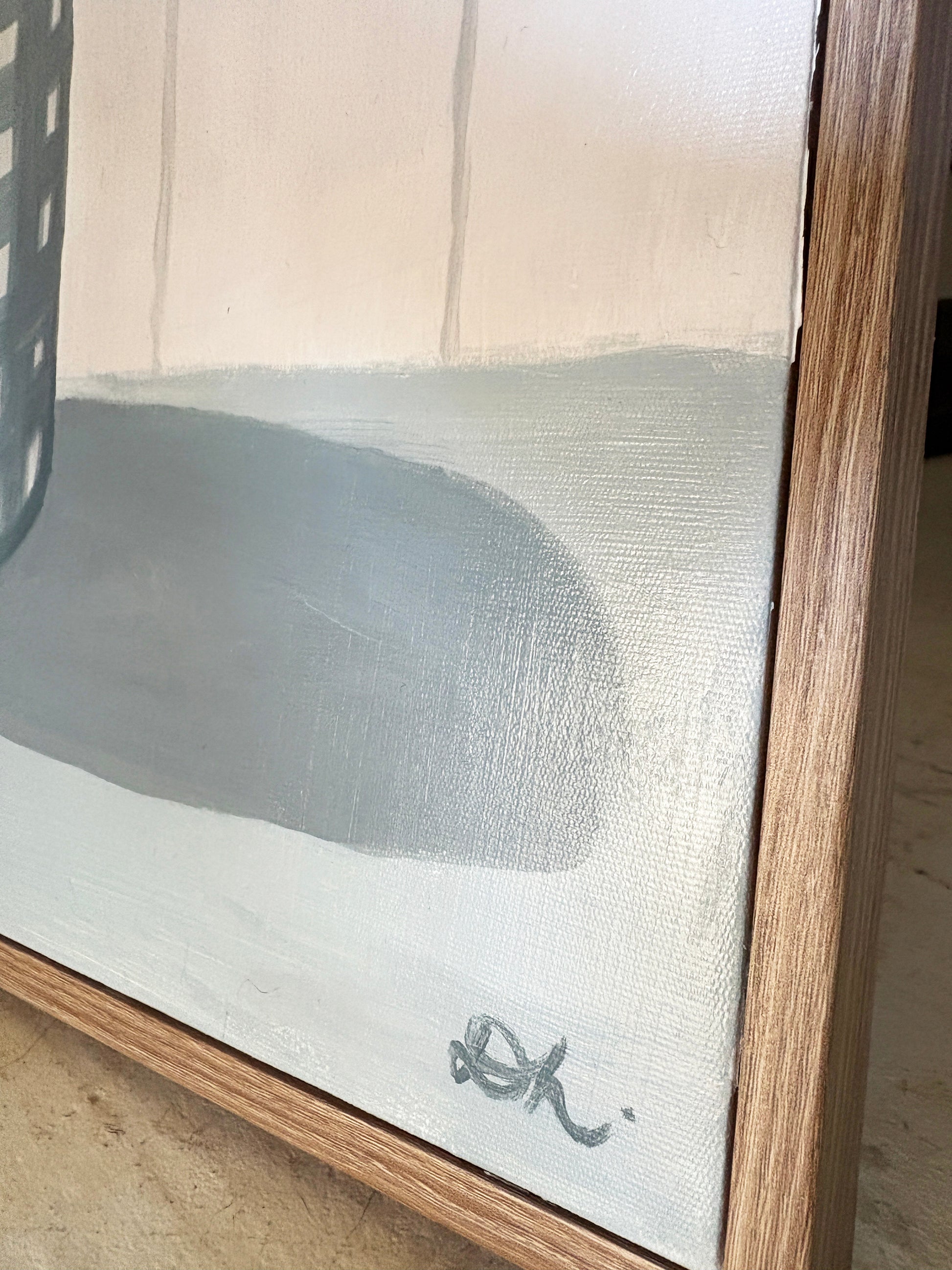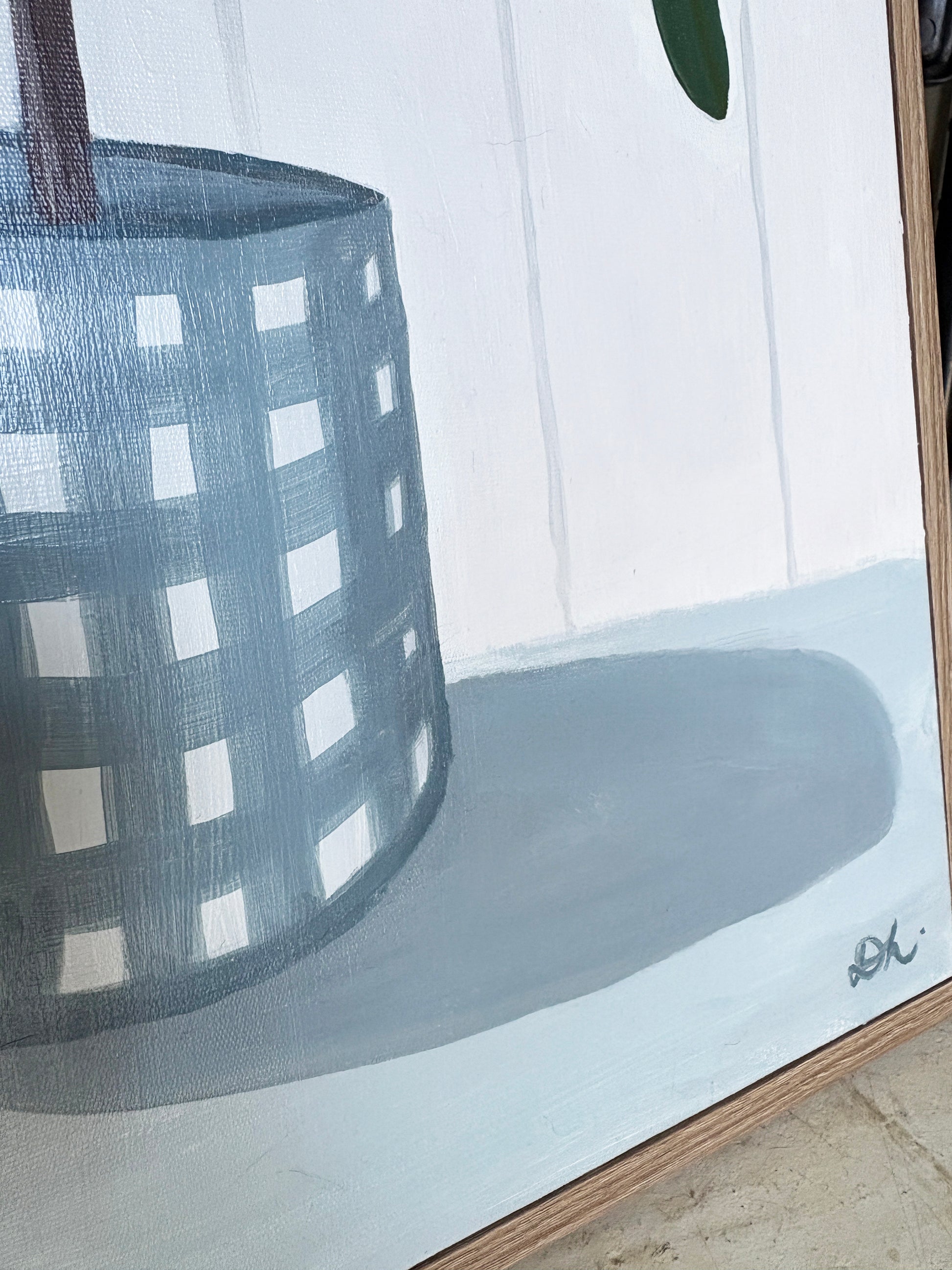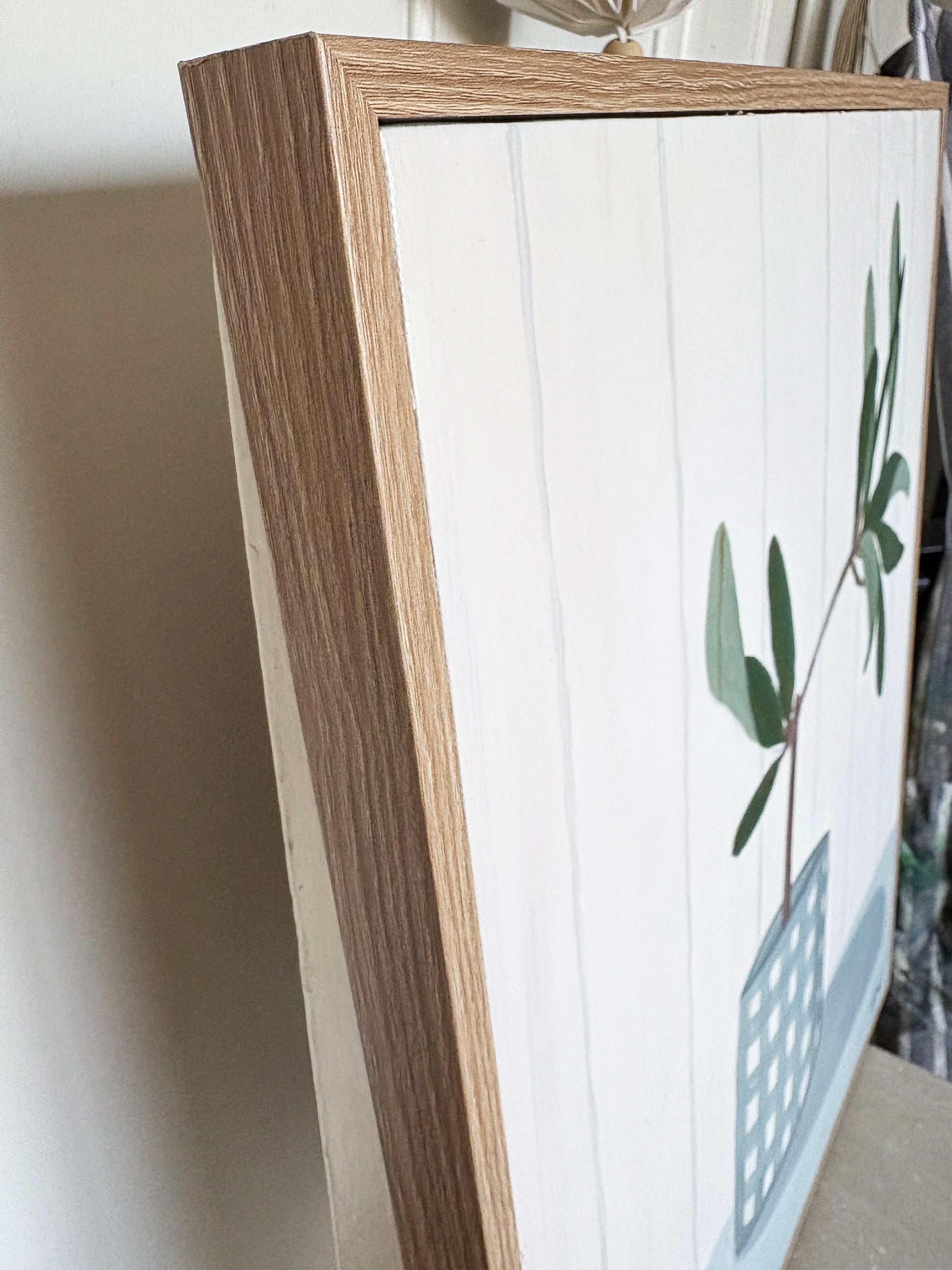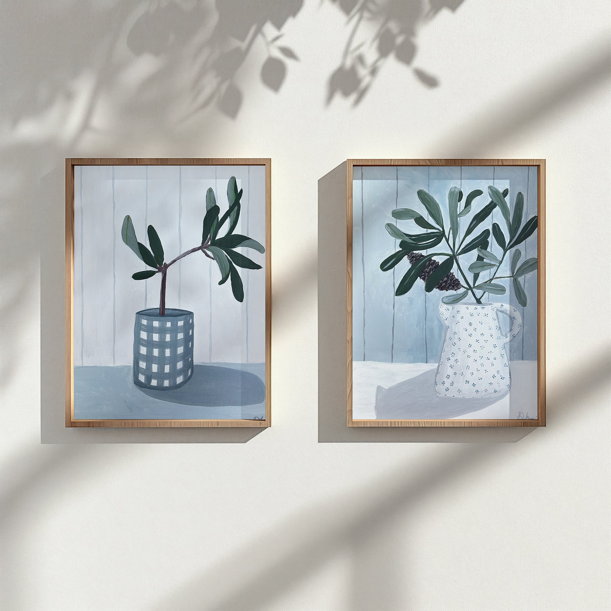 This original acrylic artwork, framed in a fixed frame, features a charming blue and white gingham vase holding a single branch of banksia leaves. The vase rests on a dusty blue table. the soft, creamy white background with subtle tongue-and-groove wall panels adds texture and depth, enhancing the peaceful, timeless beauty of the scene. Perfectly framed, this piece evokes a sense of tranquility.