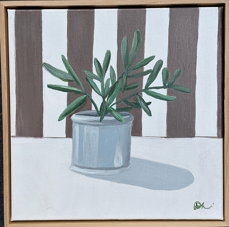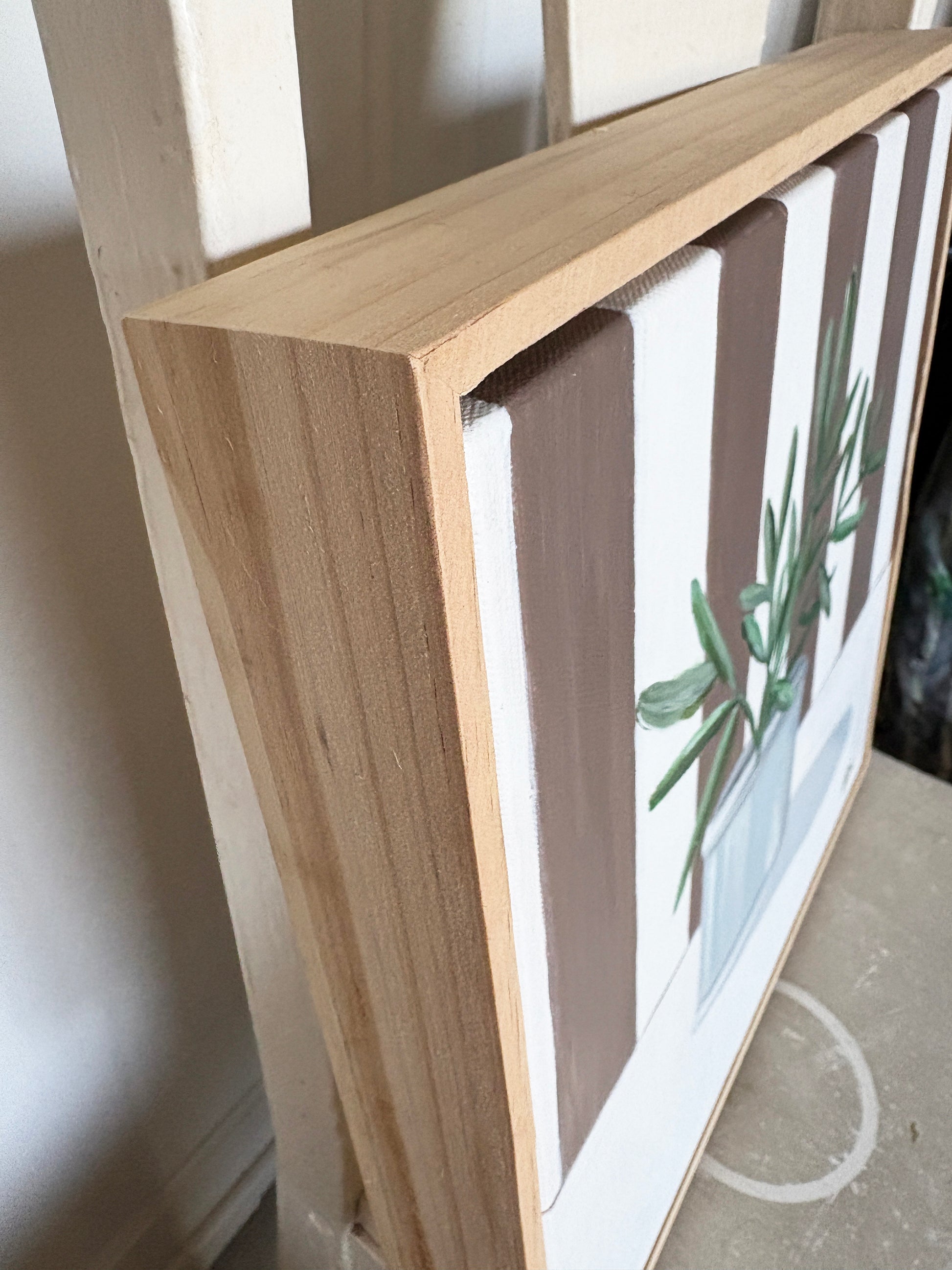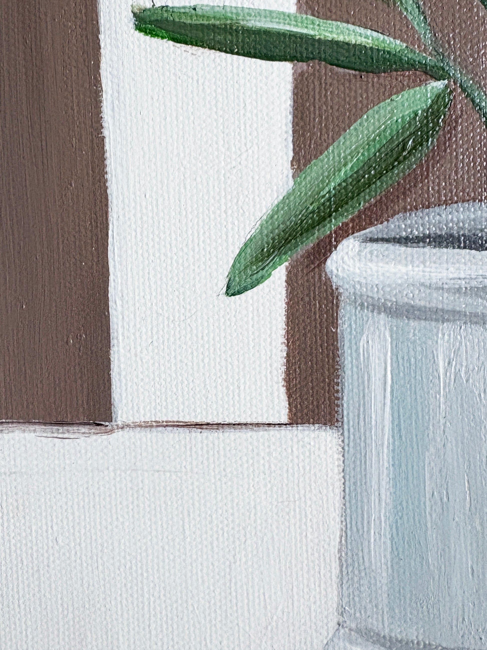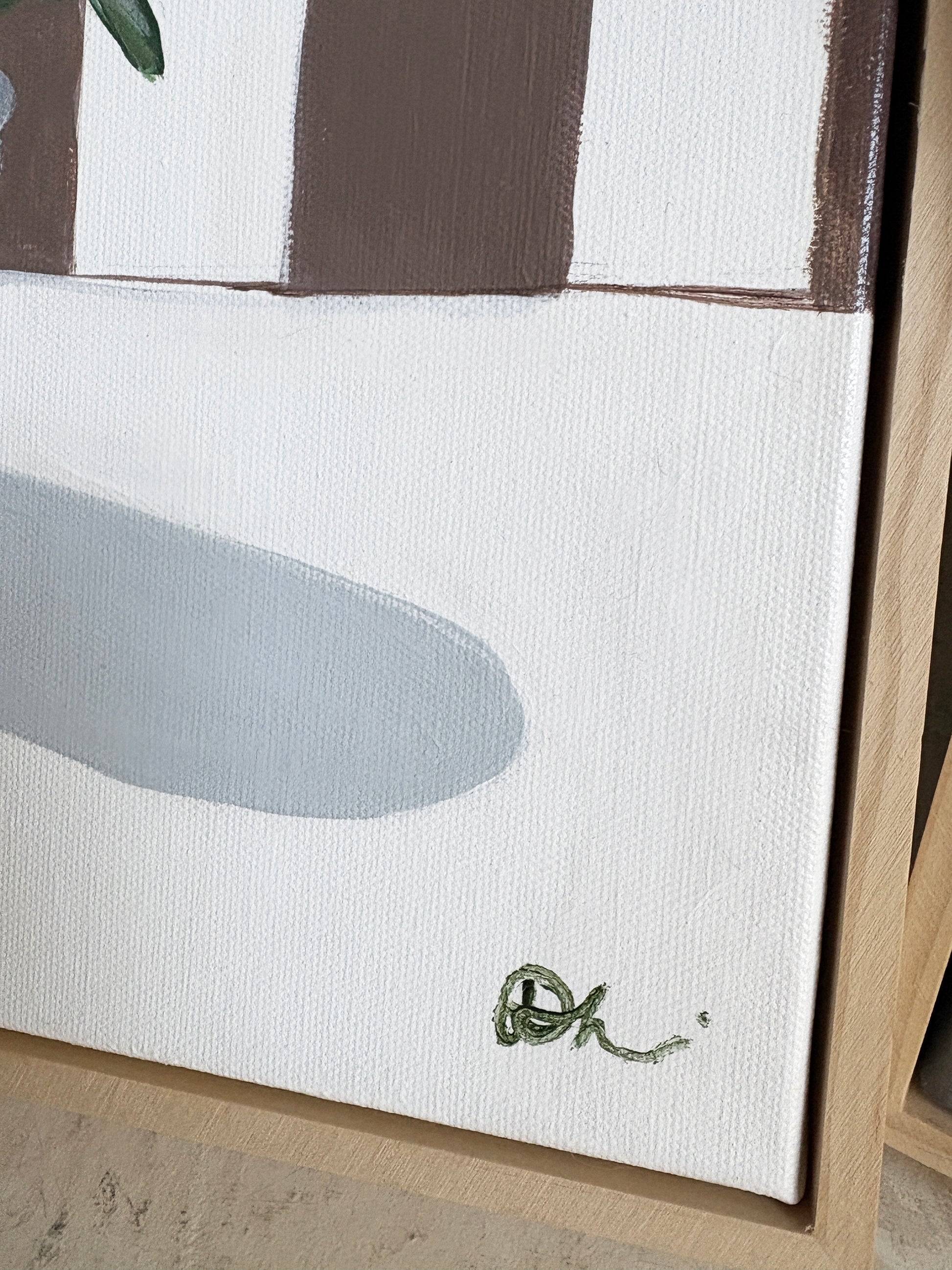 This original acrylic painting showcases a small grey vase holding a delicate branch of olive leaves, gracefully positioned on a simple bench. The subtle, earthy tones of the vase and leaves are beautifully contrasted by a wide stripe wallpaper in brown and white, creating a harmonious balance of color and texture. Framed for an elegant finish, this piece evokes a sense of calm and understated beauty.