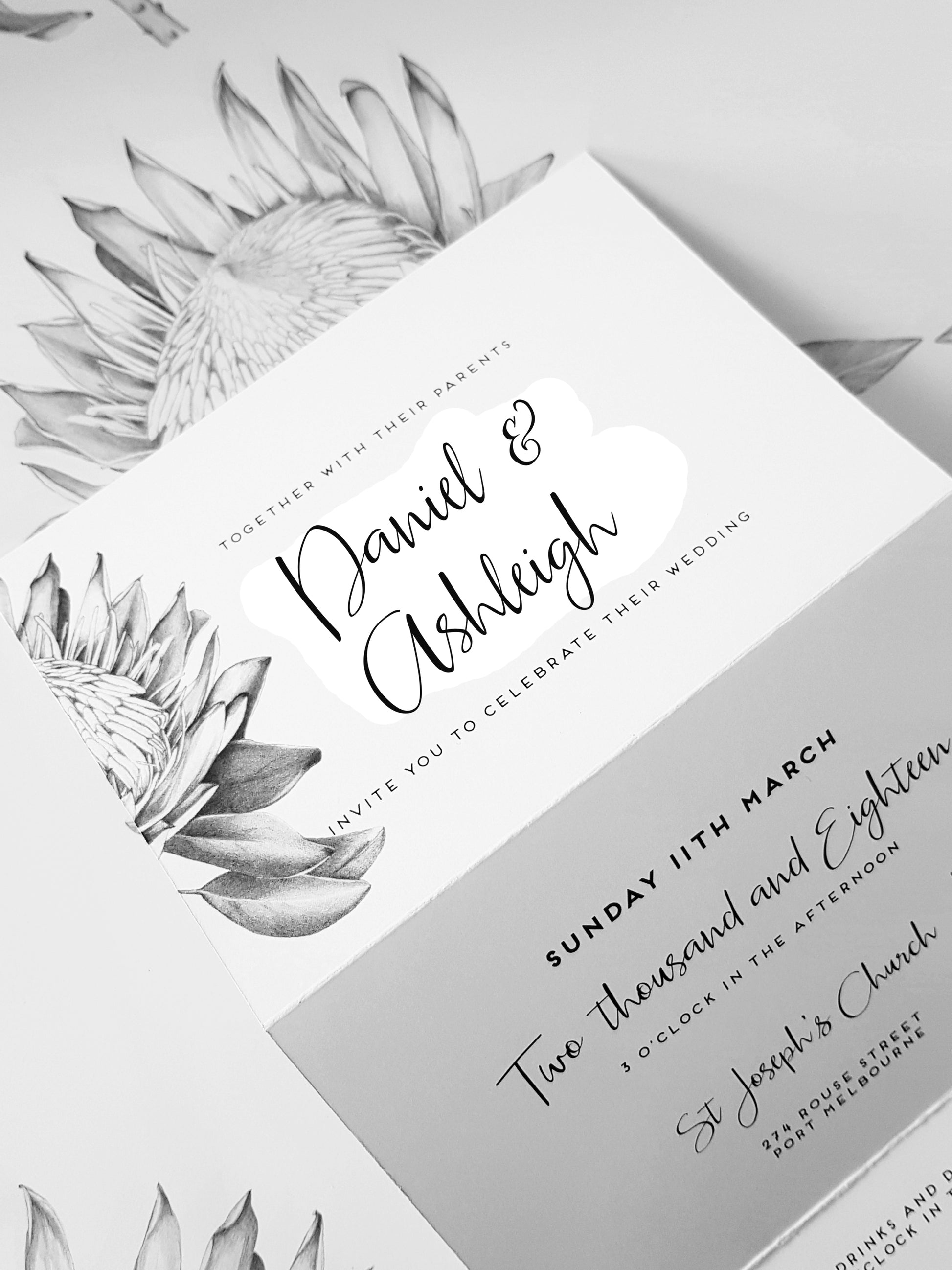 TRIFOLD PROTEA, this design is sure to impress your guests and set a beautiful tone to your wedding day.